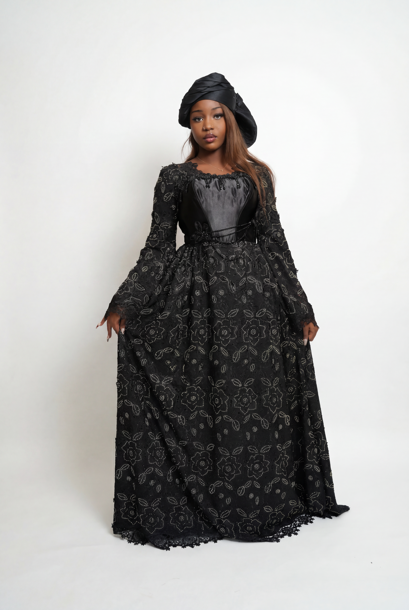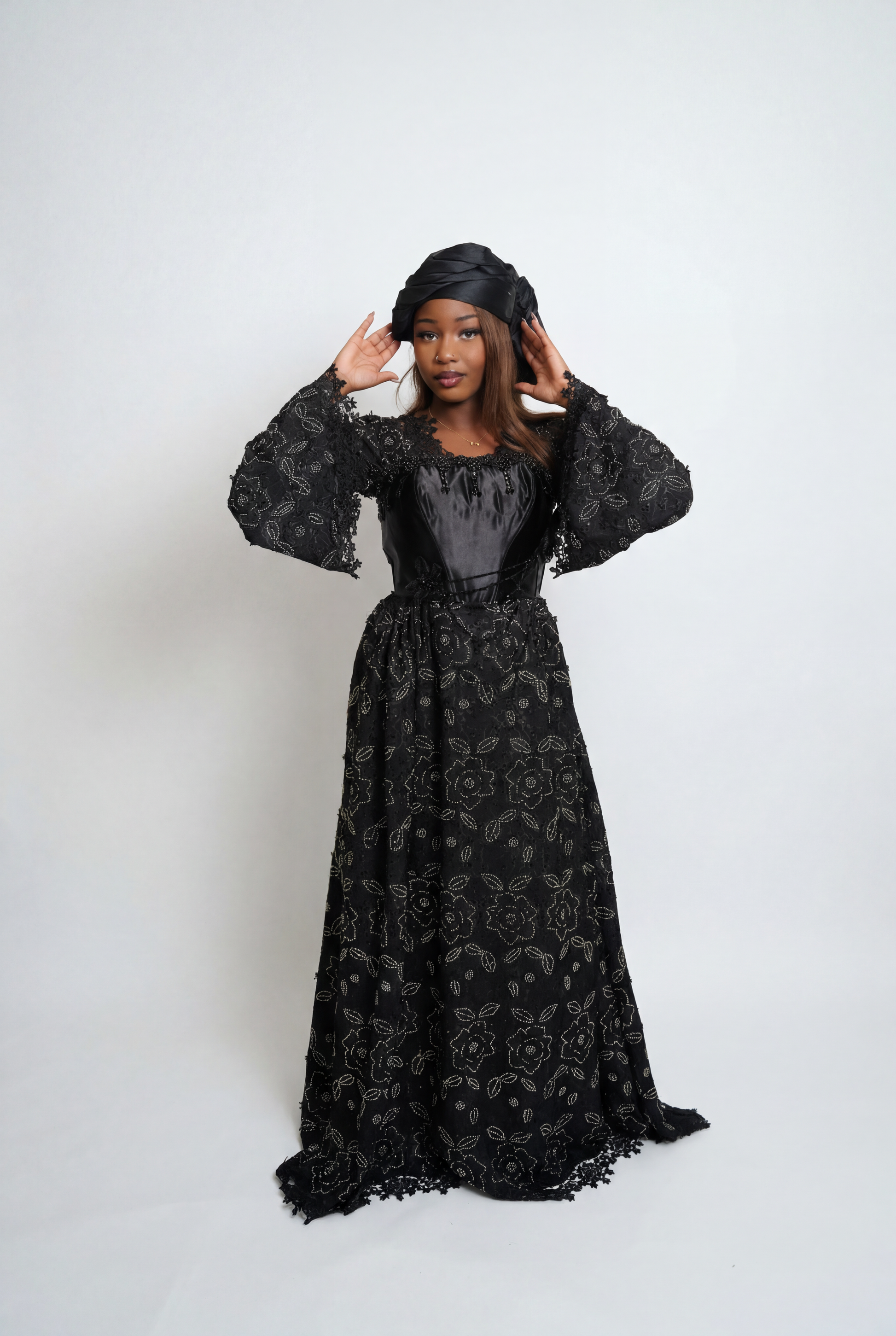 Robe noire en brodé scintillant, sublimée par un haut en satin délicatement orné de perles.