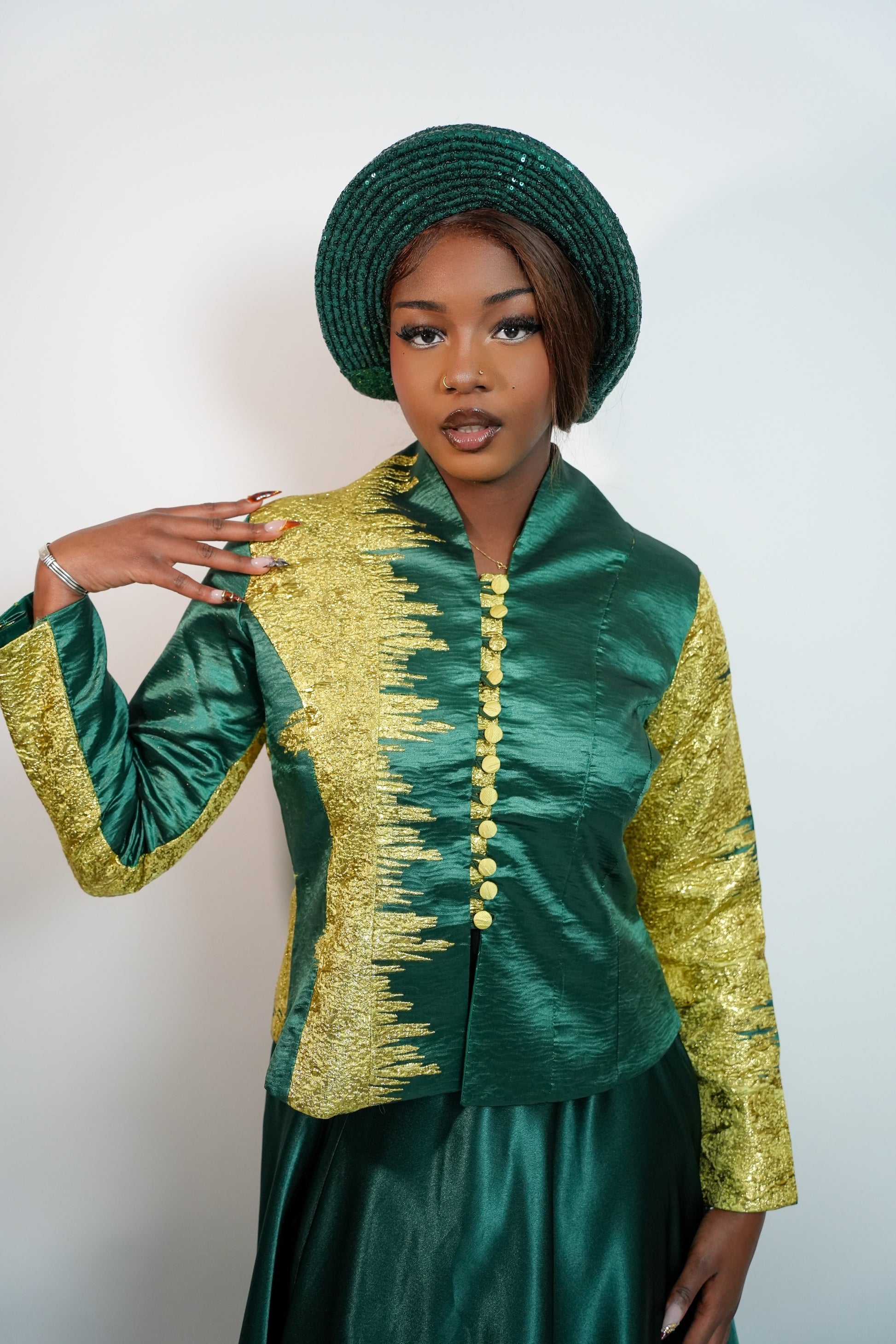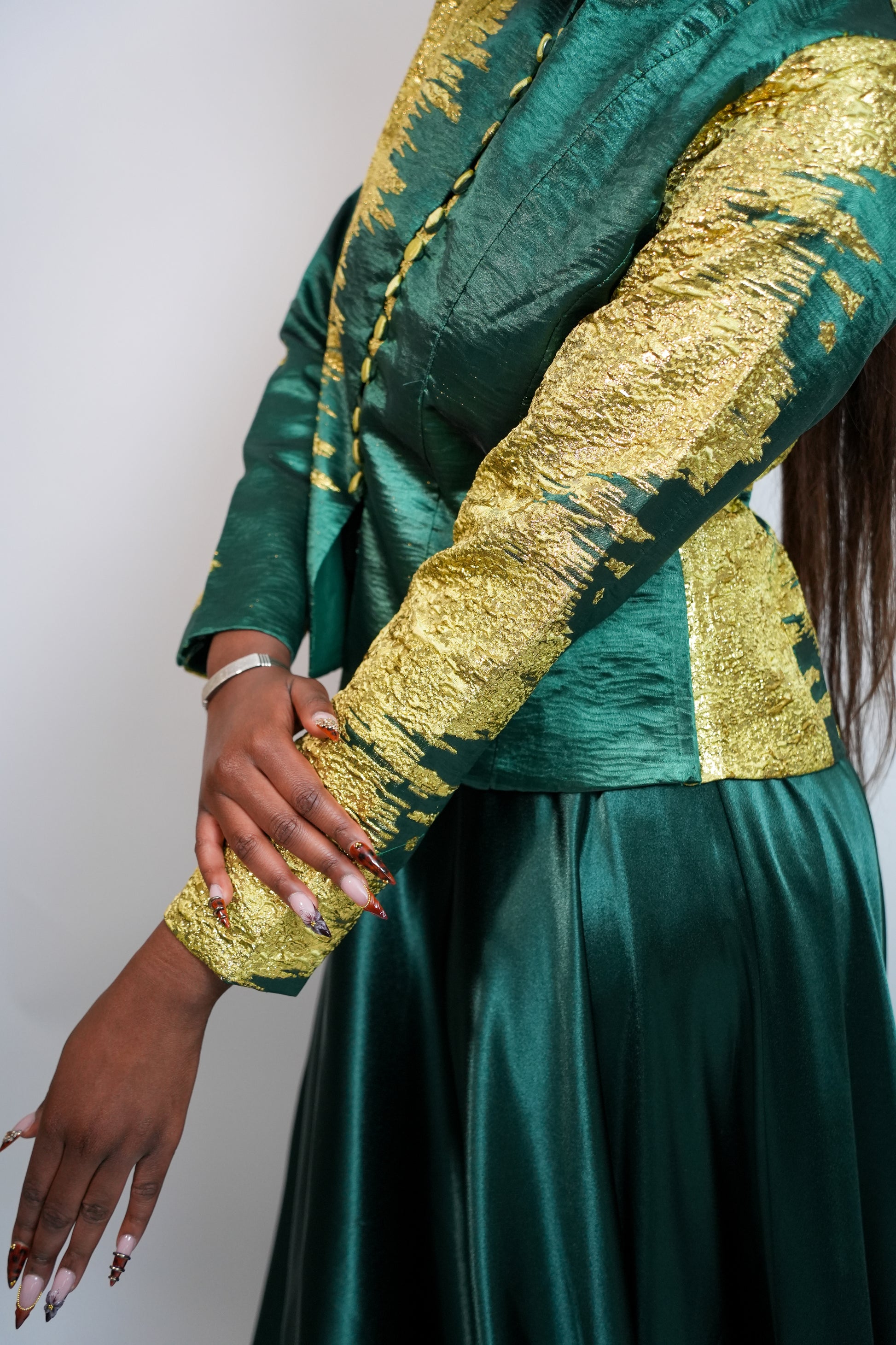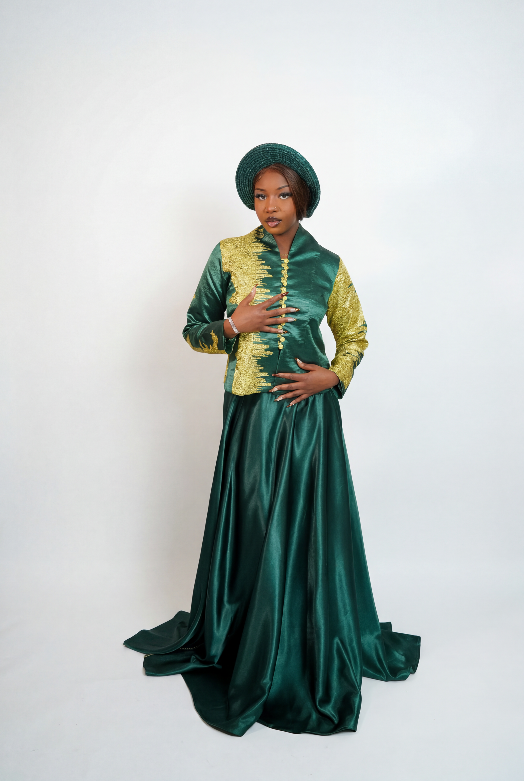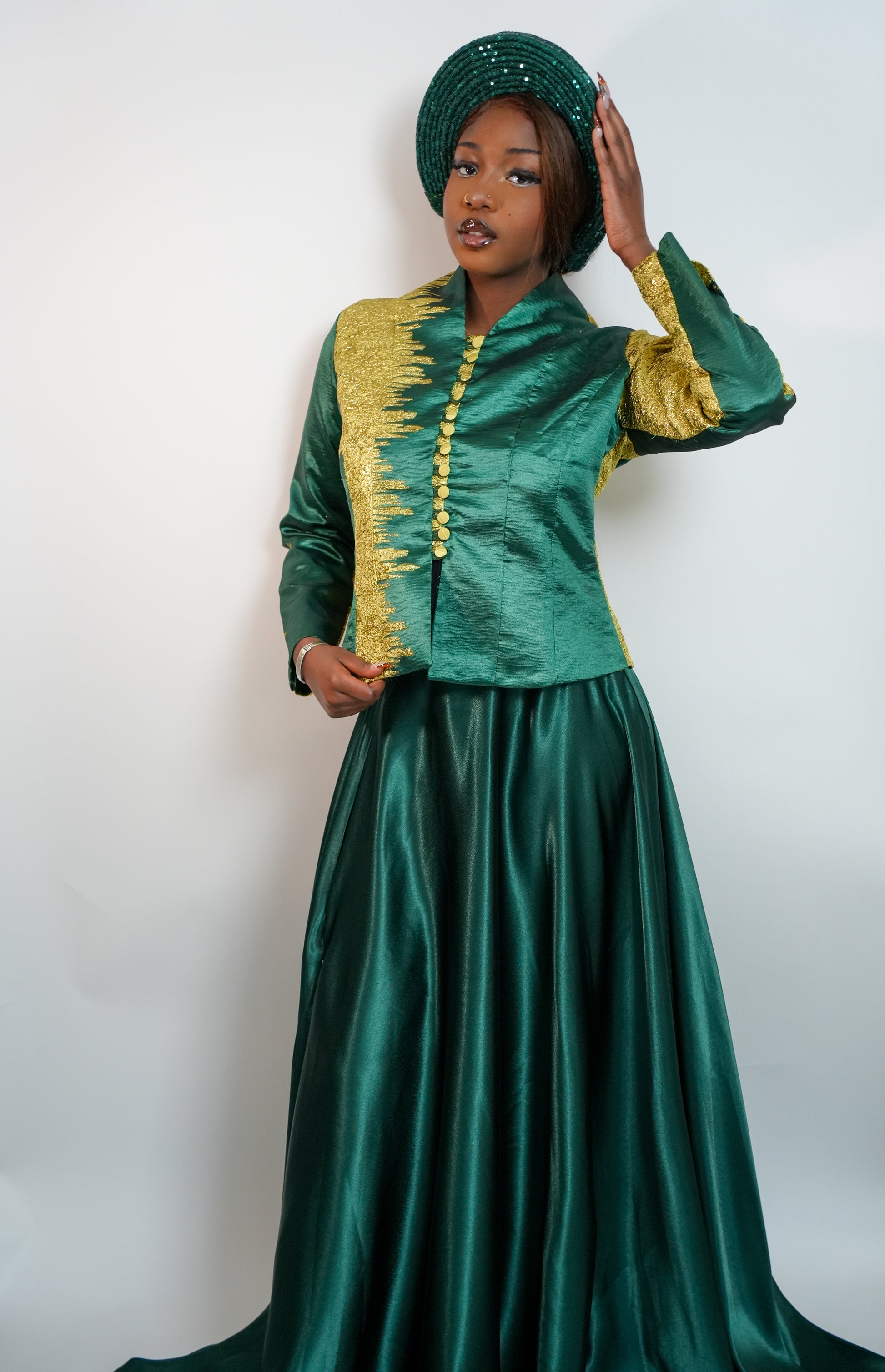 Haut en brocart vert émeraude aux subtils reflets or, associé à une jupe longue en satin vert à la coupe fluide et majestueuse.